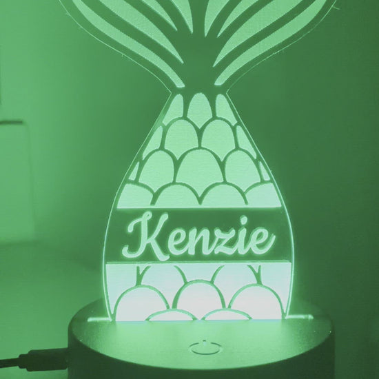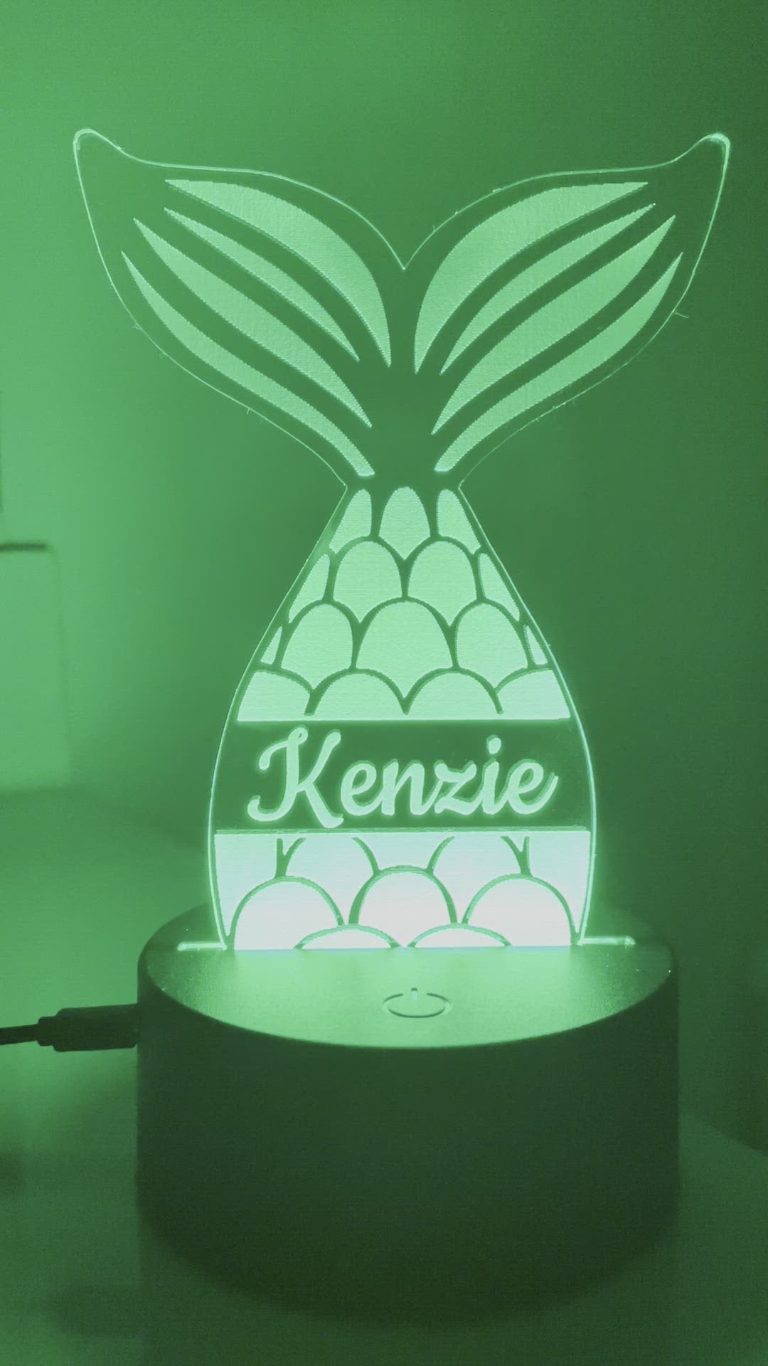 Laser cut and engraved acrylic night light. Measures approximately 5" wide by 6.5" tall. Comes with base that makes it color changing and remote. Battery operated (batteries not included) or USB powered (cord included but no power adapter).