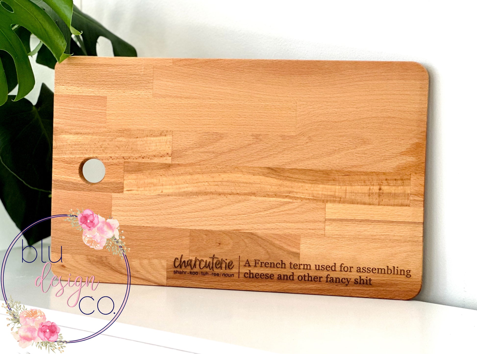 This funny cutting board is made of beechwood and laser engraved. Measures approx. 7” x 17”.