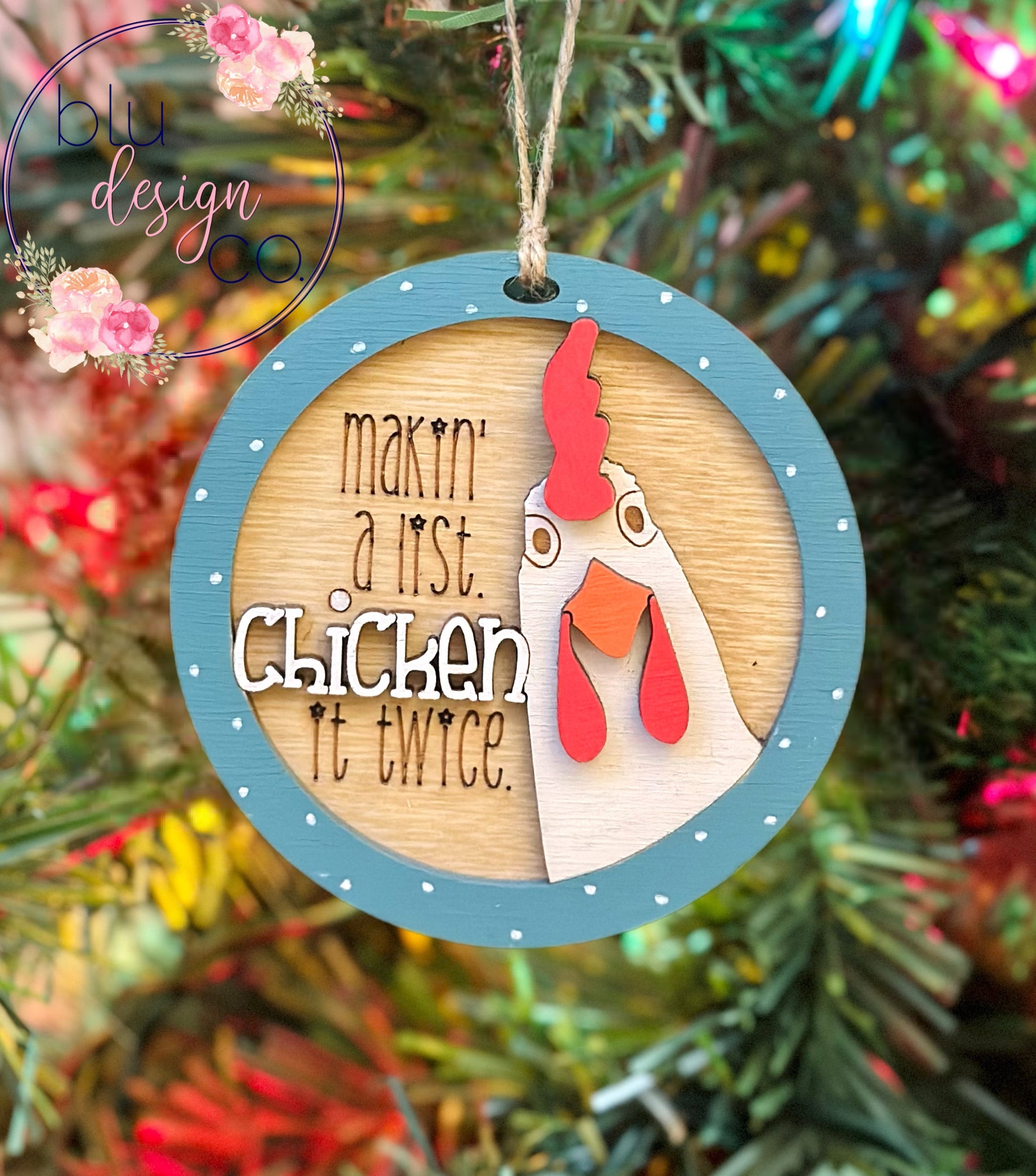 This fun layered ornament is made from laser cut stained and painted wood. Measures approx 3.5” in diameter.