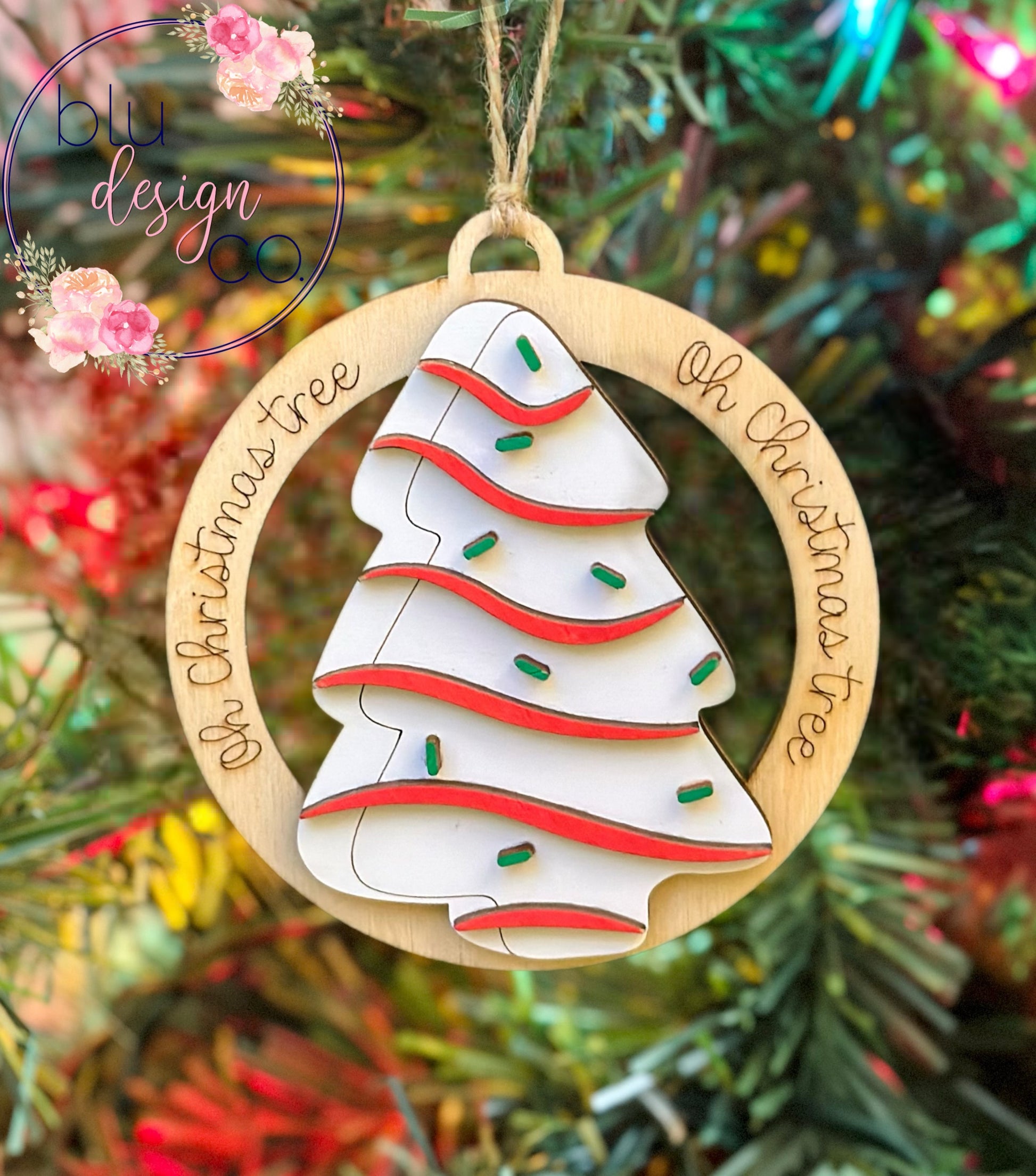 This fun layered ornament is made from laser cut stained and painted wood. Measures approx 3.5” in diameter.