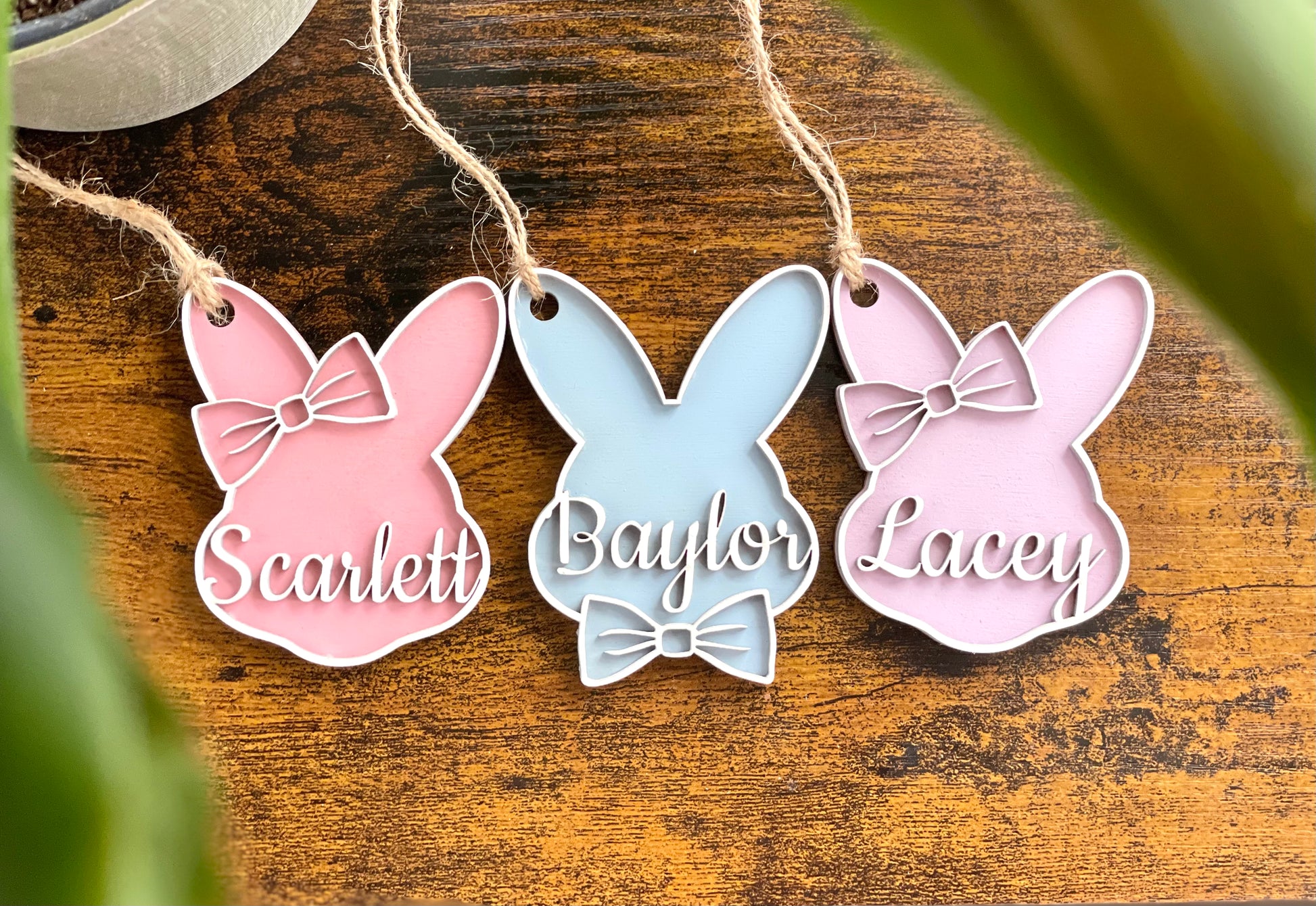These wooden basket tags are personalized with the name of your choice. Finished with a twine string left untied so that you can easily attach it to your basket. Each one measures around 3.5" tall.