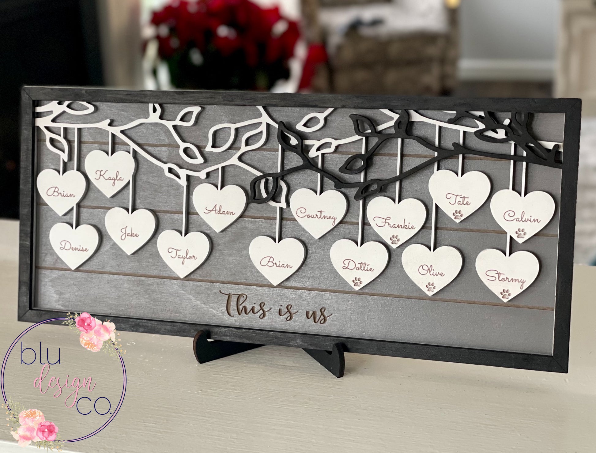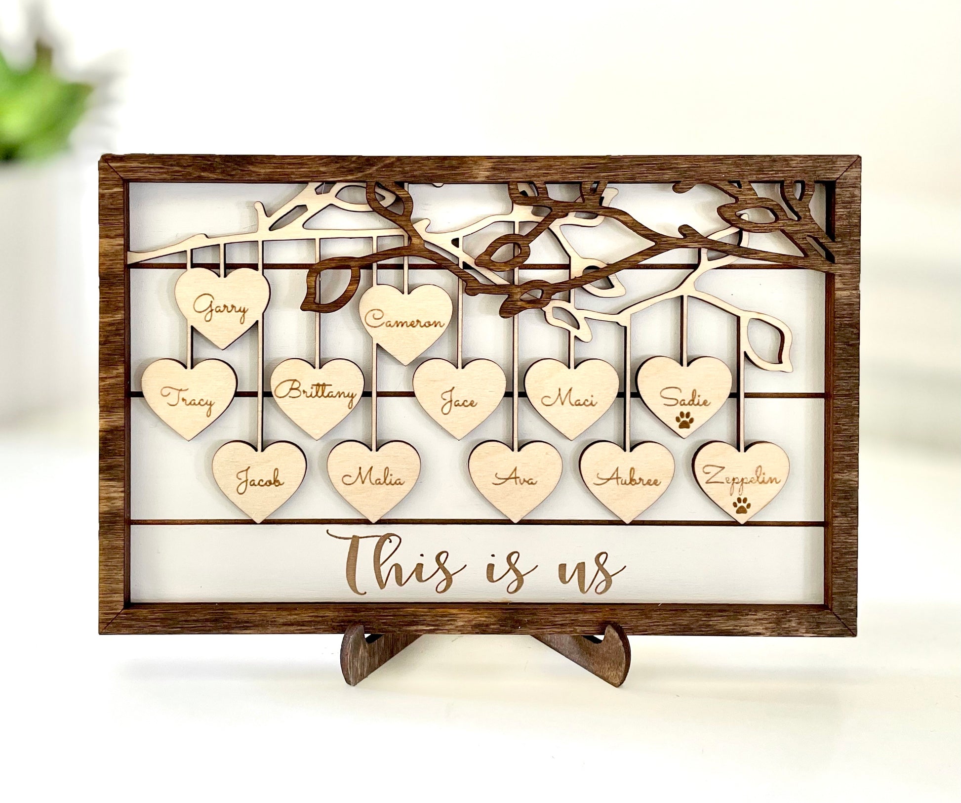 This custom wood family sign would make the perfect gift for yourself, your mom, your grandma, etc. Great for Mother's Day, birthday, or Christmas gift idea! Laser cut and engraved with your choice of phrase towards bottom and names of choice on hearts. Names will go from left to right on the hearts. Size of sign varies based on number of names. Stand included.