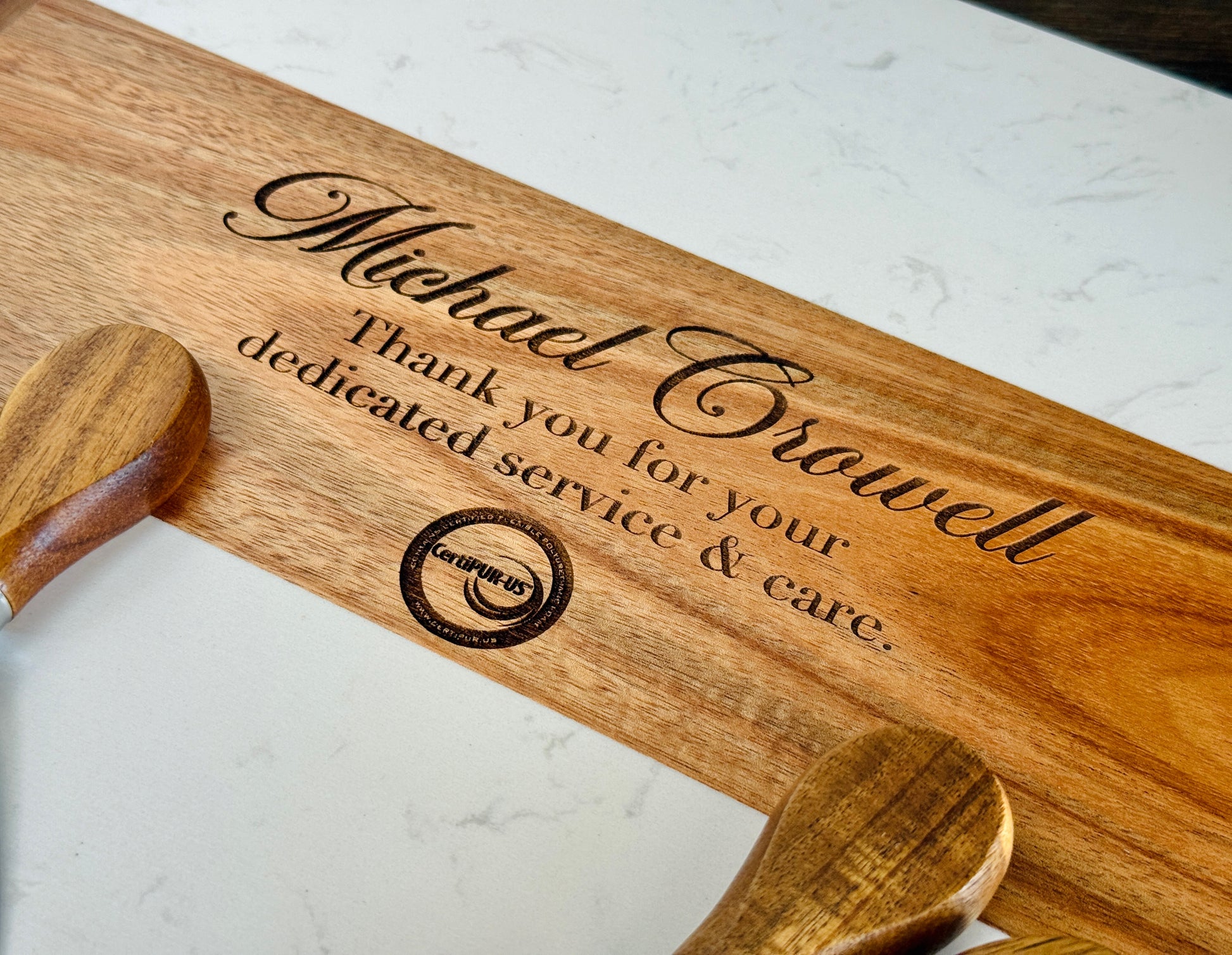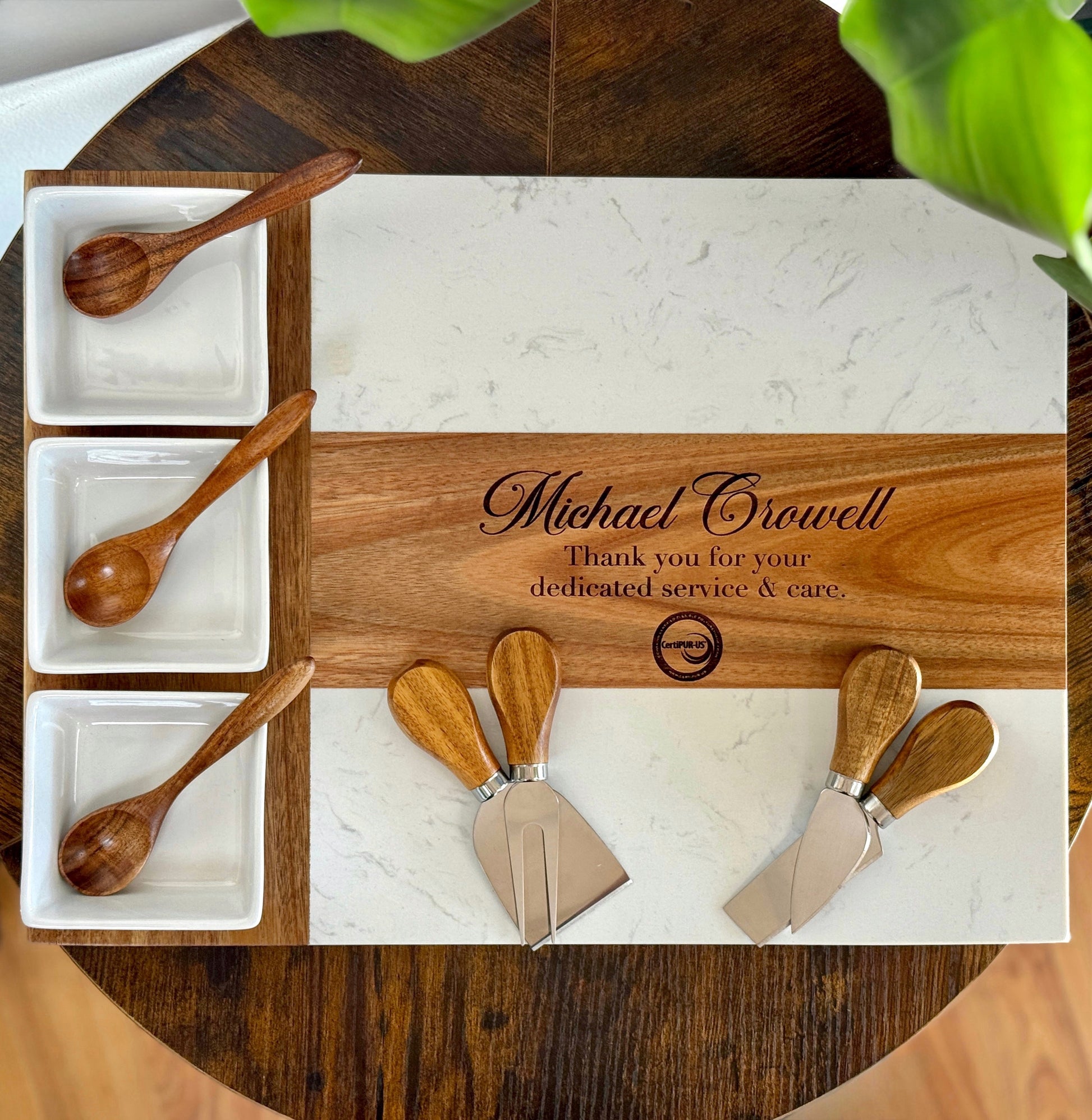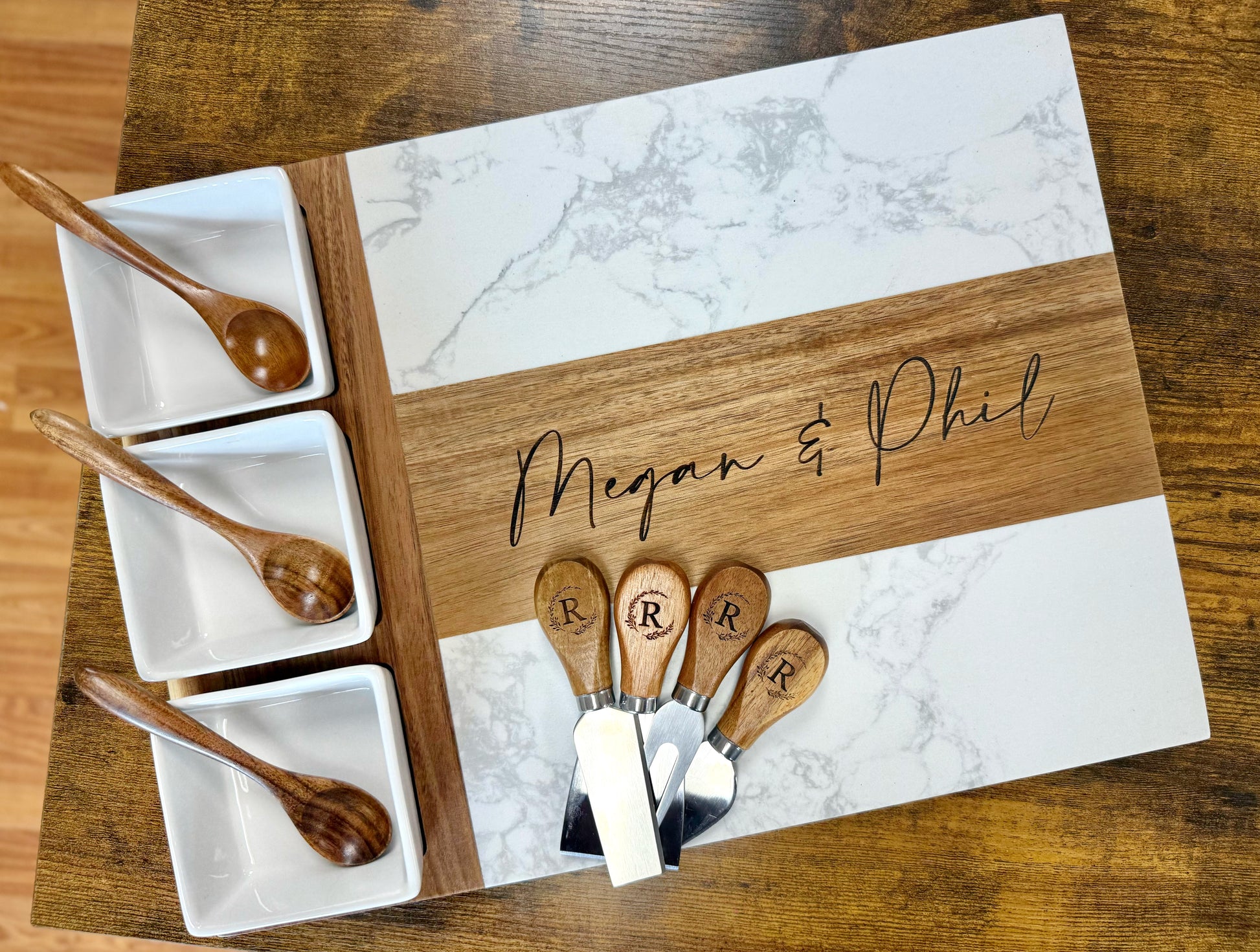 Elevate your hosting game with our stunning Marble Charcuterie Board 11-Piece Gift Set, where timeless elegance meets functional design. Crafted from luxurious white marble and premium acacia wood, this board offers a rich contrast of textures and tones—perfect for serving cheeses, meats, fruits, and more in style. Includes engraving of your choice on board and cheese knives.