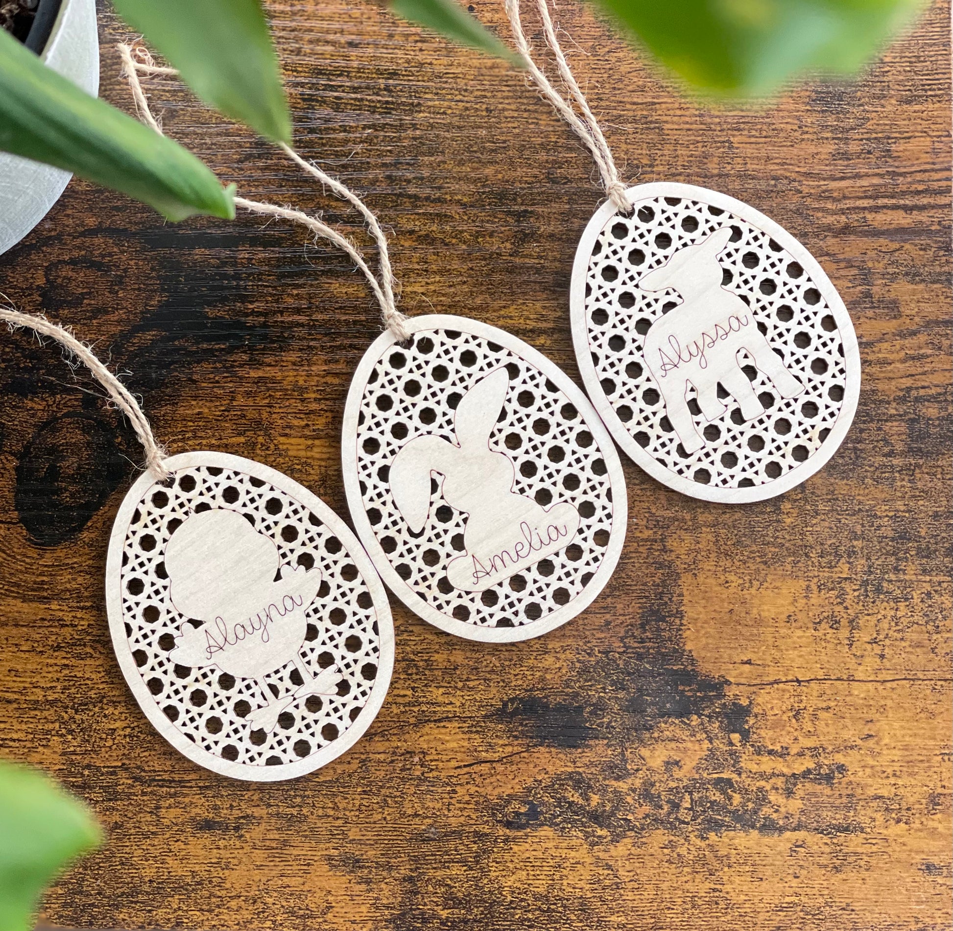 These wooden basket tags are personalized with the name of your choice. Finished with a twine string left untied so that you can easily attach it to your basket. Each one measures around 3.5" tall.