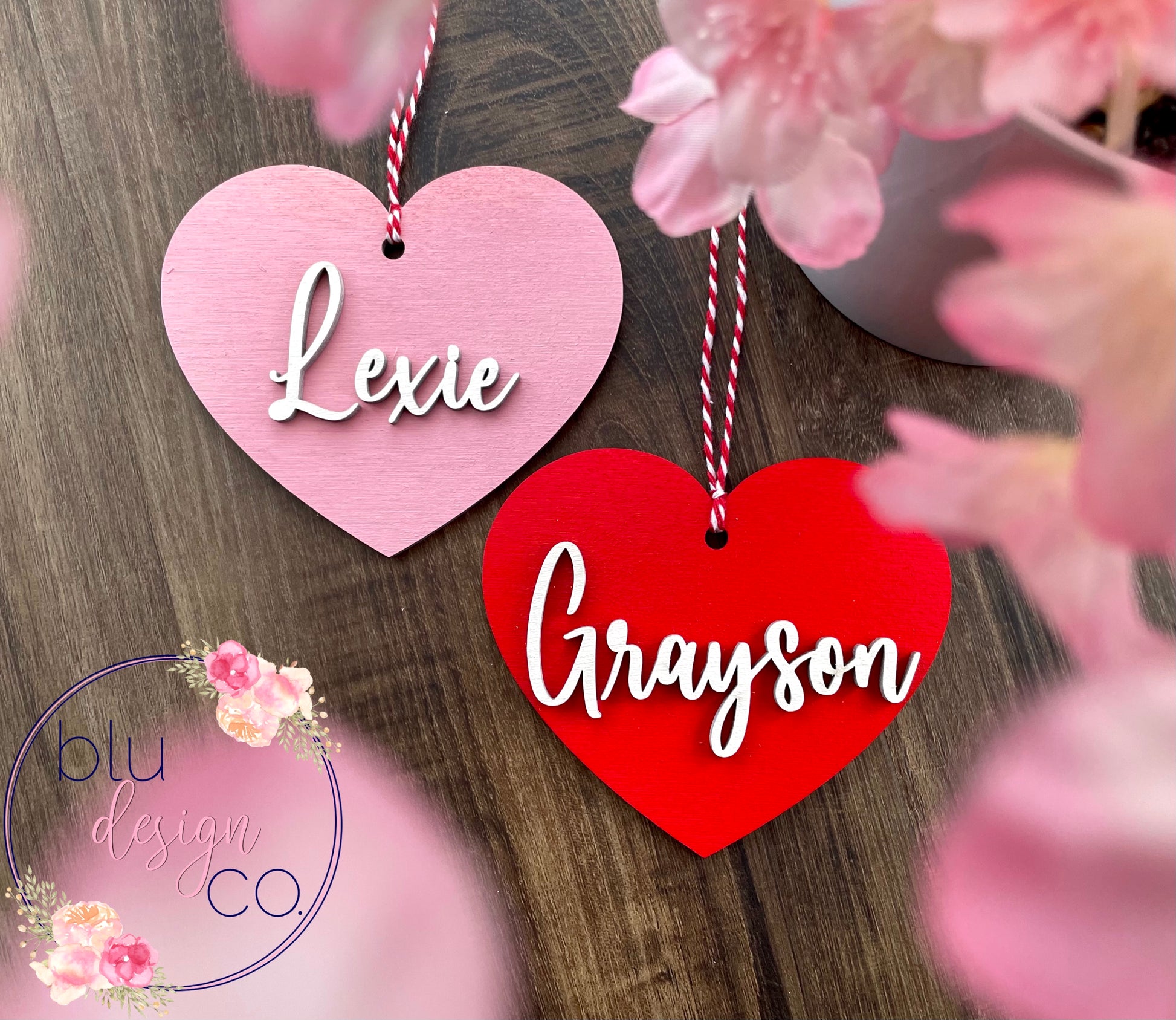 These wooden heart basket tags are personalized with the name and color combo of your choice. Finished with a red and white string left untied so that you can easily attach it to your basket. Each one measures around 4" tall.