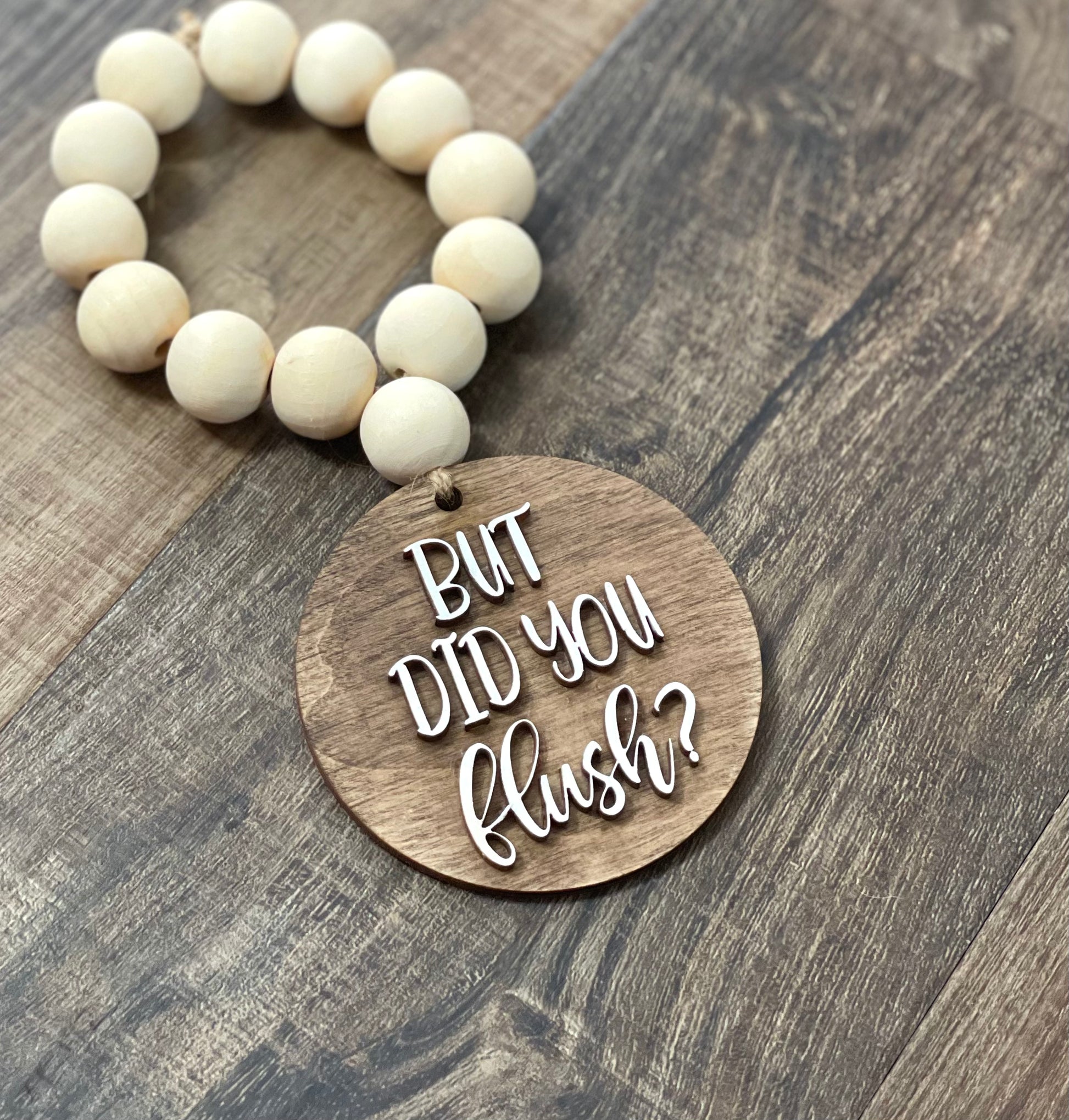But did you flush? Remind your kids with this bathroom door handle sign! Wooden round measures approx. 3” in diameter. Made of painted and stained layered wood.