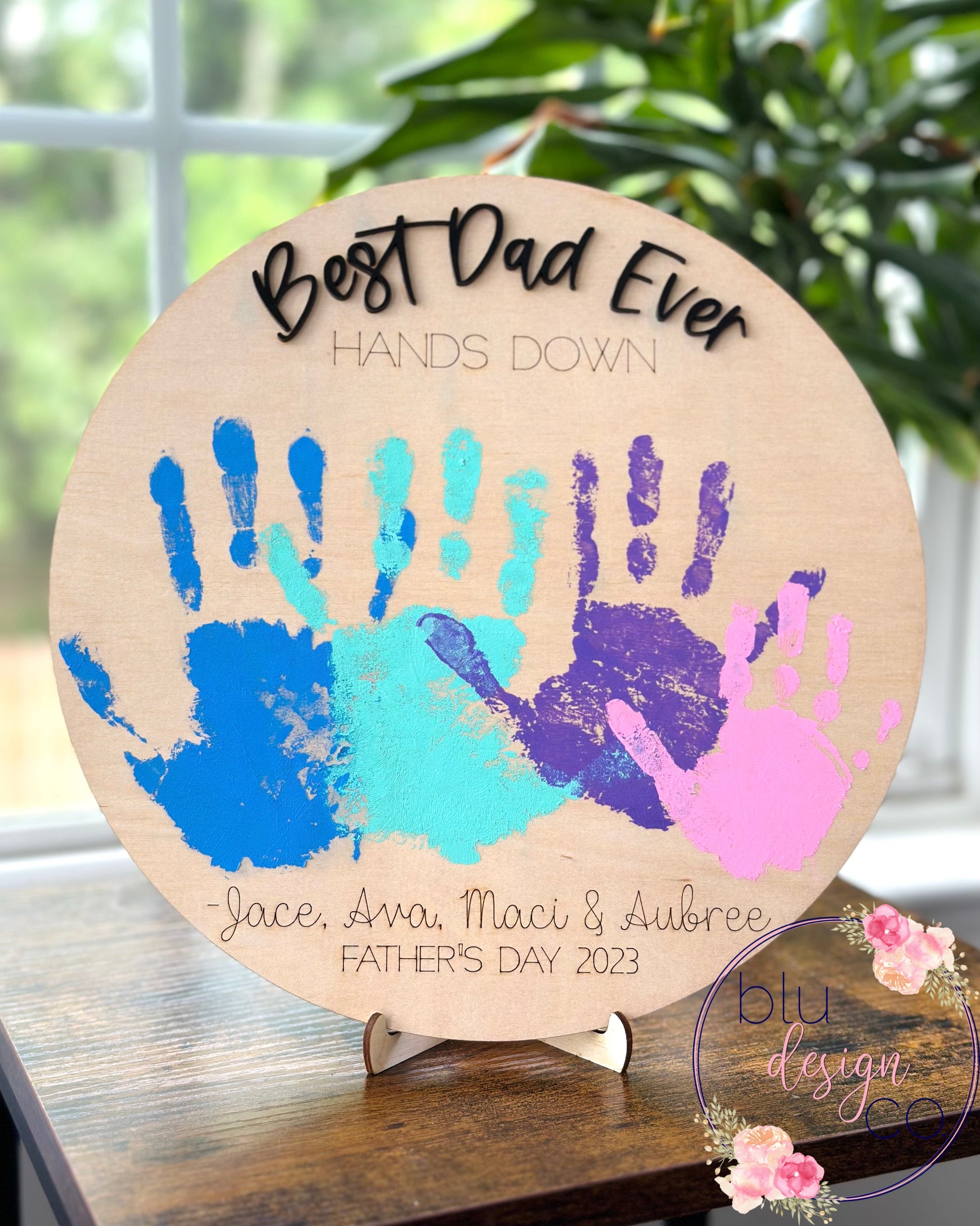 Create your own special handprint sign with our wooden engraved round! This sign will make the sweetest, most unique gift for Father’s Day. Simply cover your little one’s hand in paint of your choice and stamp it down.