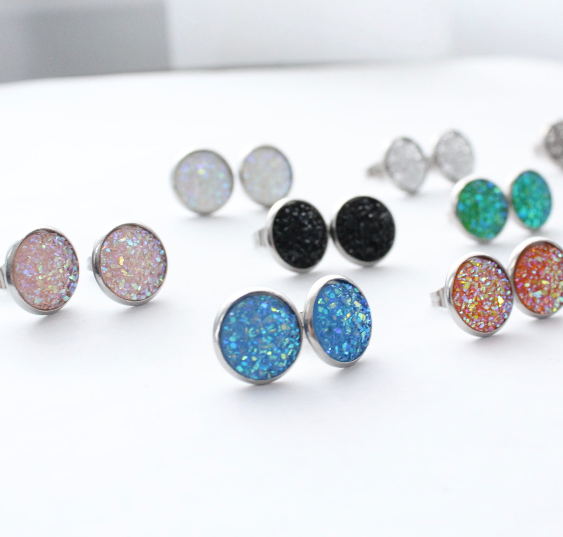 If you love to sparkle, then you'll love these druzy earrings. These earrings are made with surgical grade stainless steel posts. Available in multiple colors in 8mm or 12mm. Last photo (of different earrings) shows 12mm size for reference.