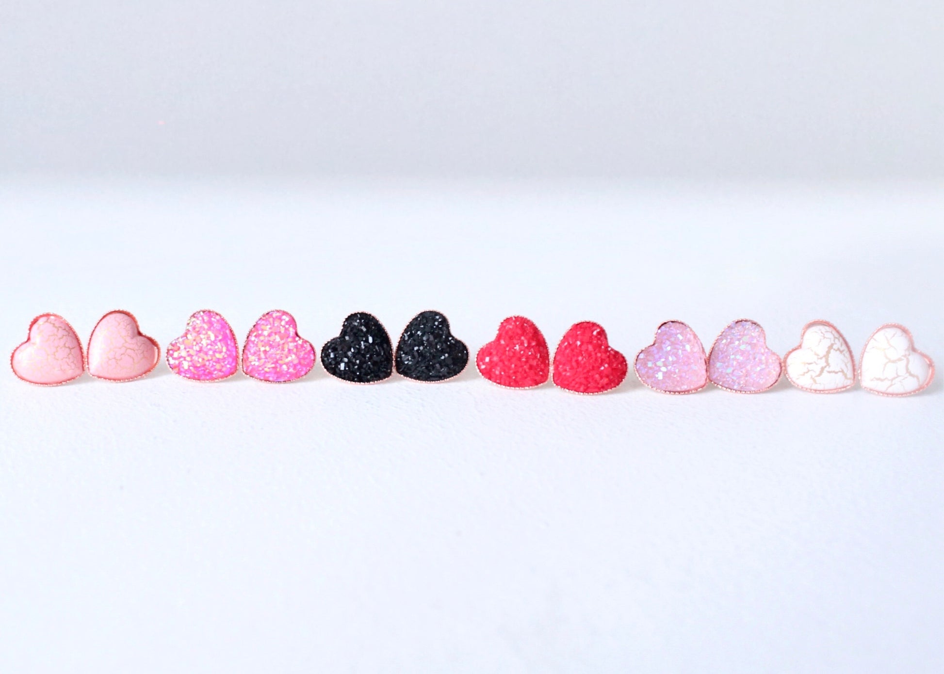 If you love to sparkle and shine, then these sweet heart earrings are perfect for you. Available in pink gold crackle, hot pink druzy, black druzy, red druzy, light pink druzy, and white gold crackle. These earrings are 12mm and made with rose gold colored post settings.