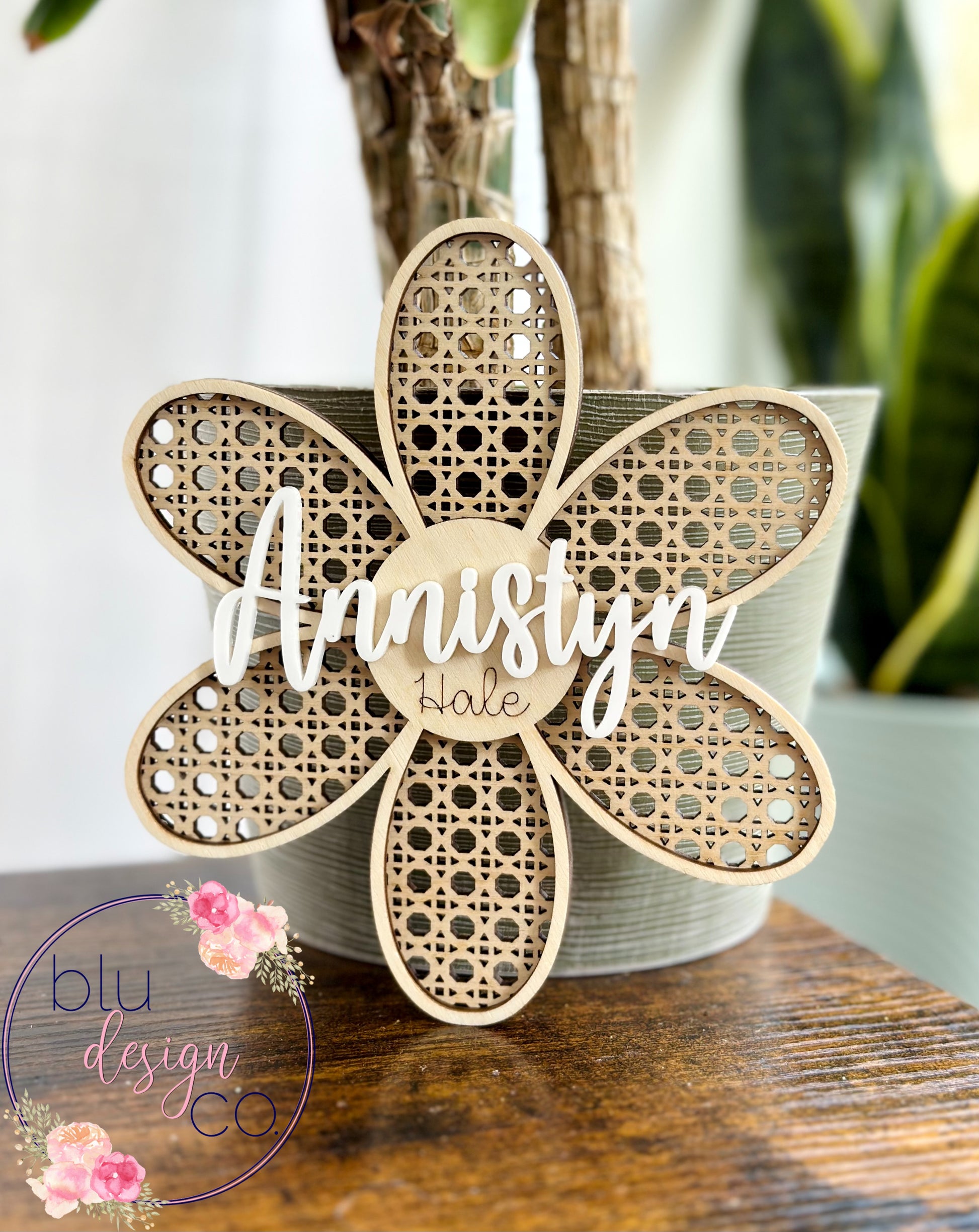Say hello to the world with this layered rattan daisy wooden name plaque with acrylic name! Measures approx. 6” tall. Perfect for baby’s first photos, announcement, etc!
