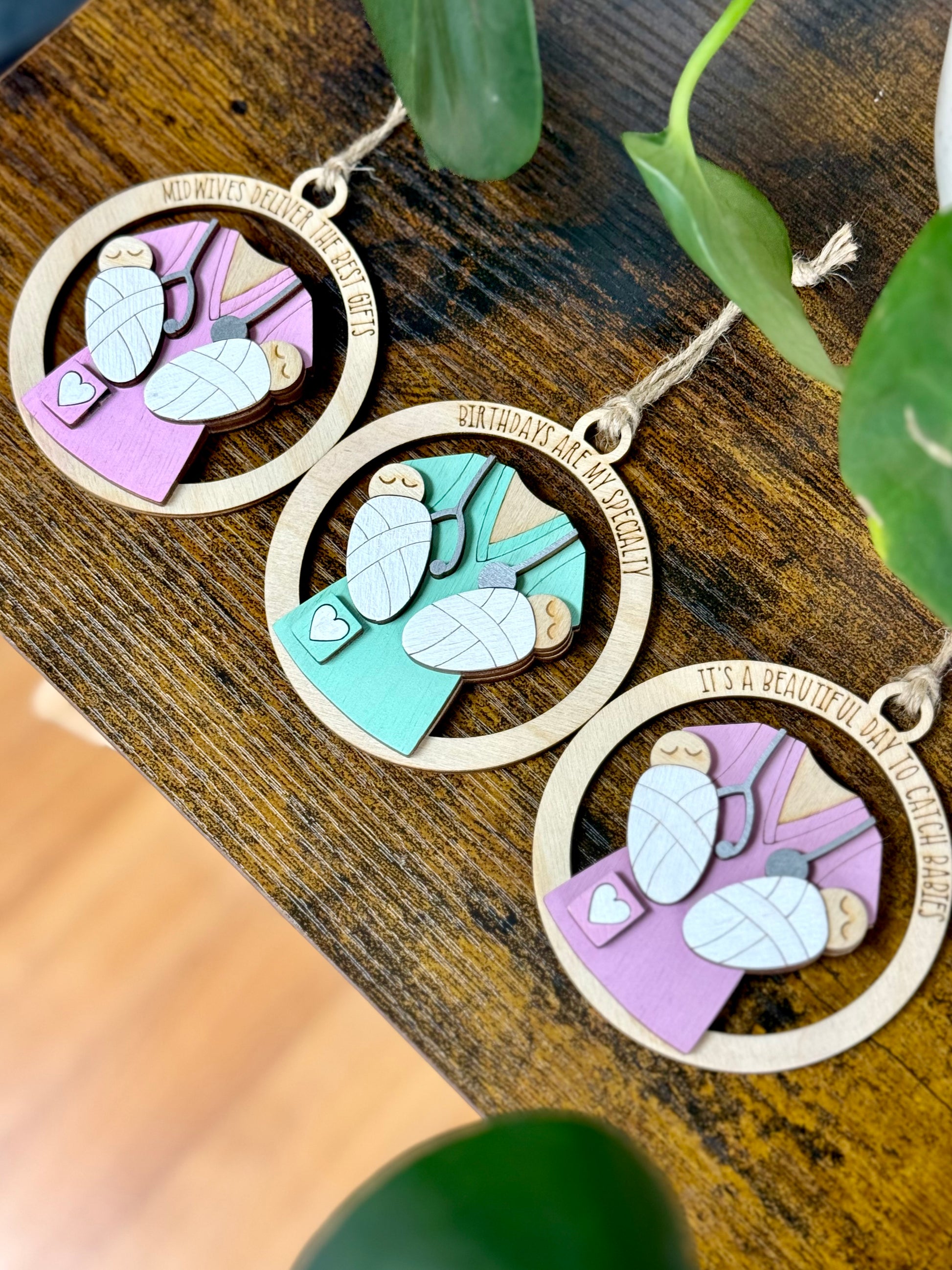 These fun labor and delivery ornaments are perfect for your favorite midwife or nurse! Choose from 3 quote options and 3 scrub top color options. Made of layered and painted wood and measure approx 3.25” wide.