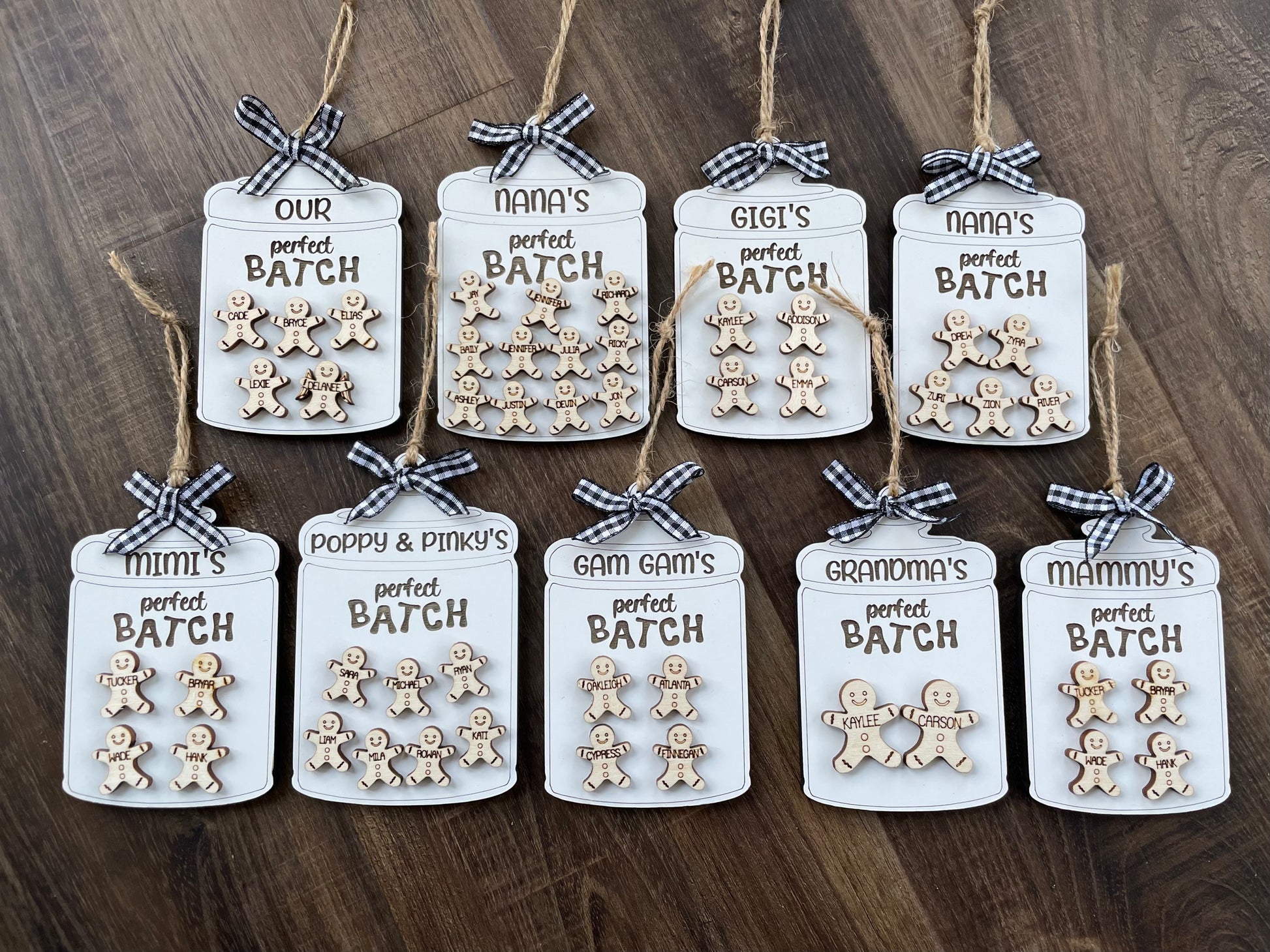 This ornament is absolutely adorable! Made of whiteboard and birch wood for a fun layered look. The higher the quantity of gingerbread, the smaller and closer together they may be. Size of the ornament itself may increase slightly to provide more room if needed, specifically for the 9-12 name option.