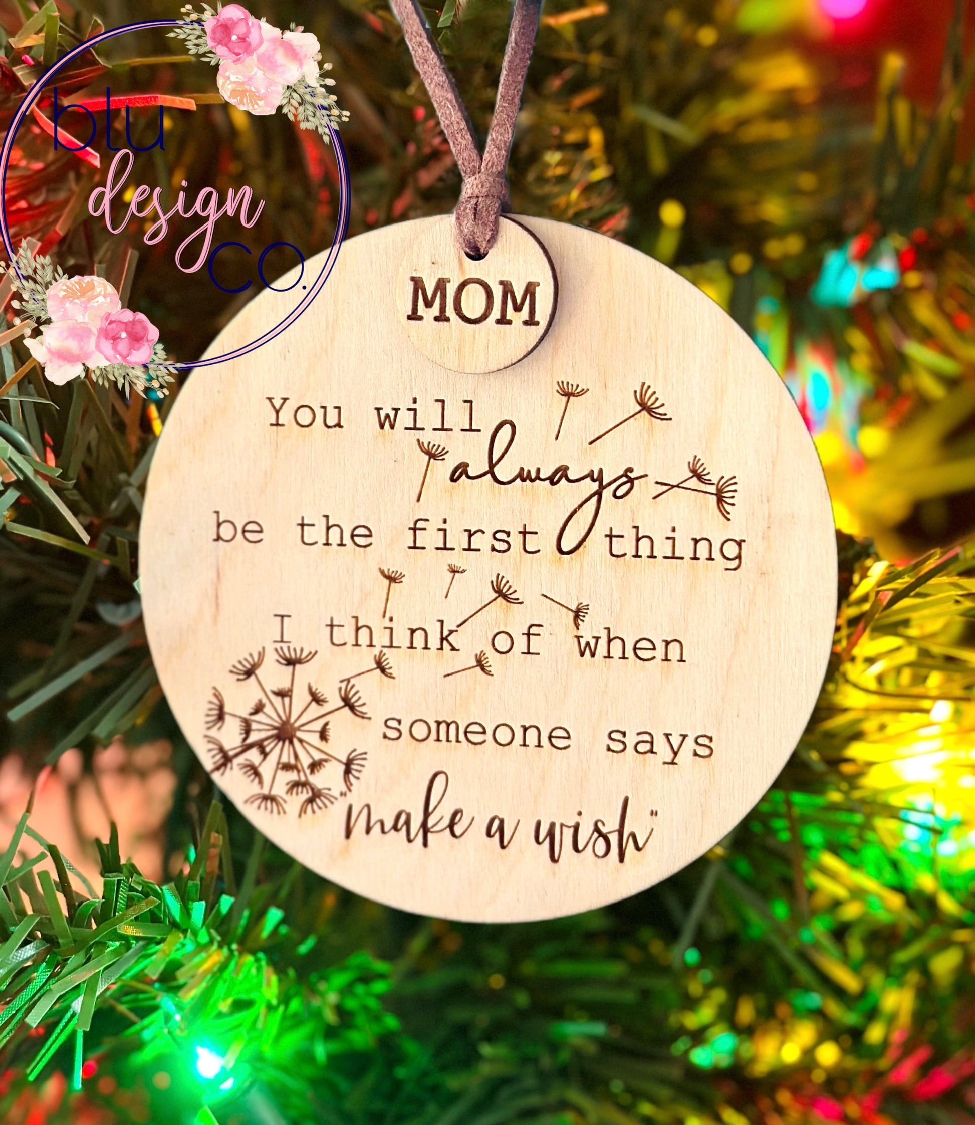 This beautiful dandelion memorial ornament can be personalized with a name tag as shown, or no name. Please specify in text box and include name if personalizing. Measures 3.25” in diameter. Made with faux suede cord string.