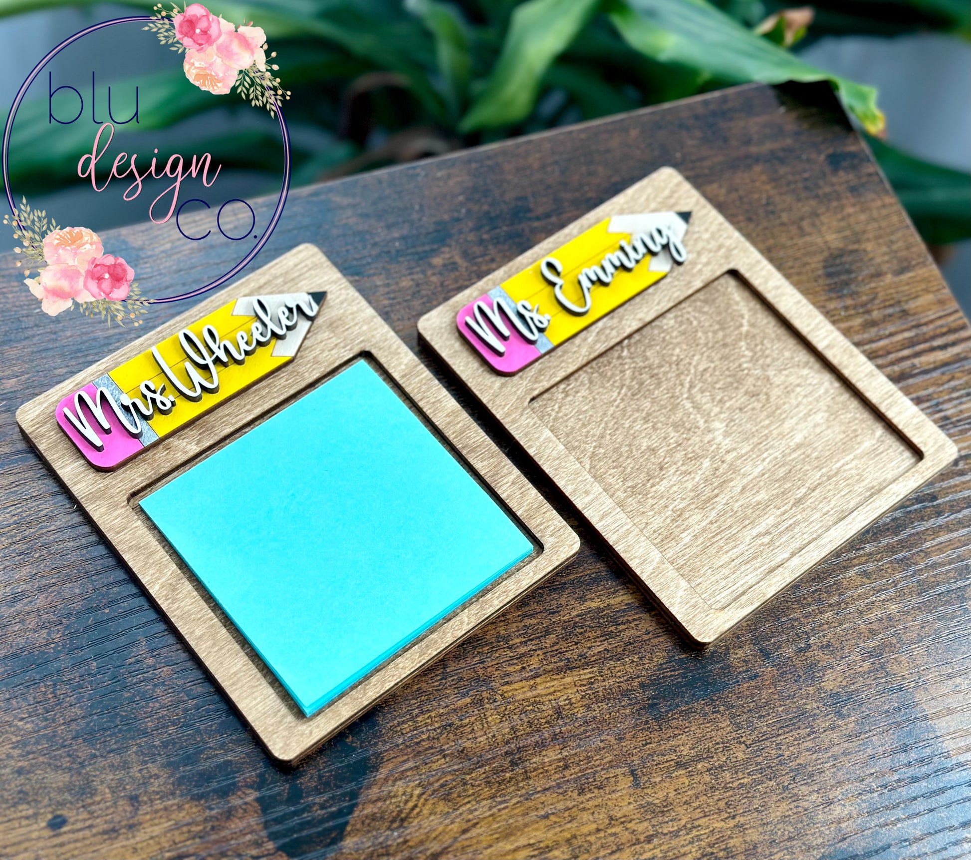 Grab a personalized sticky note holder for you or your favorite teacher to display on their desk. Both cute AND functional! Measures 4x5”. Leave teach name in text box. Sticky note pad of assorted color included.