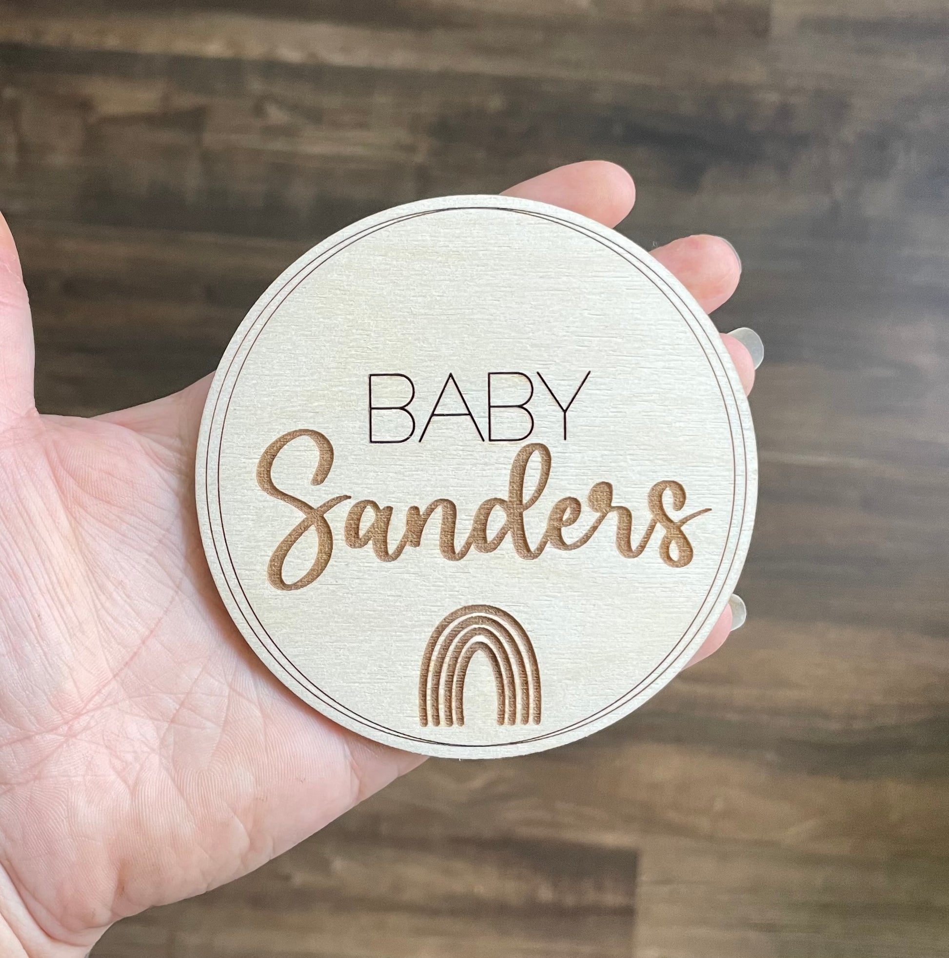 Say hello to the world with this 4“ round wooden rainbow name plaque! Perfect for baby’s first photos!