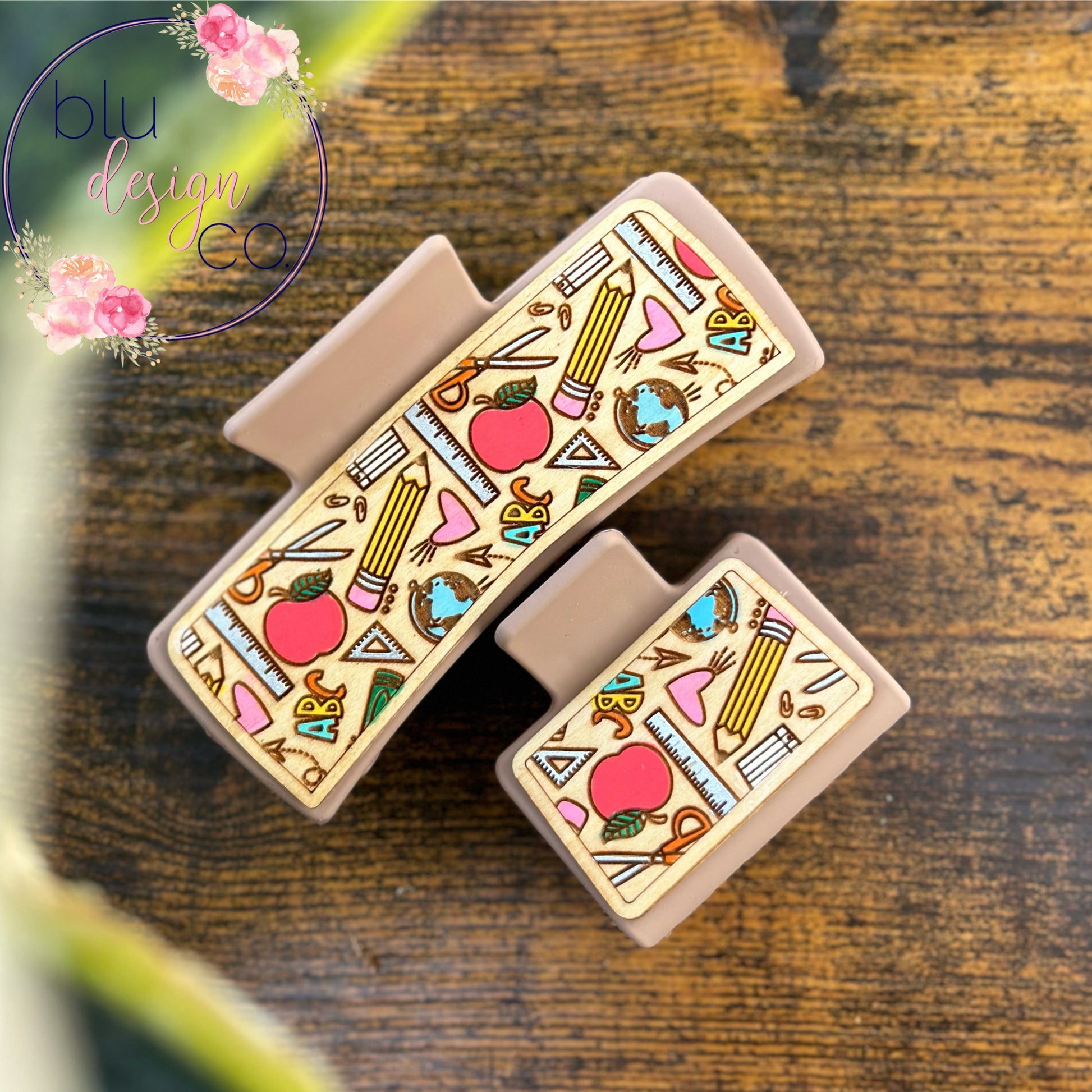 Hold your hair back in style with a unique claw clip. Available in 2 sizes: 2” or 4.2”. Adorned with a thin engraved and stained/ painted piece on both sides. Clip itself will come in randomly assorted neutral colors. Second photo shows all of the options I have to choose from. Feel free to request a preference from them, and I will get as close as possible with what I have on hand.
