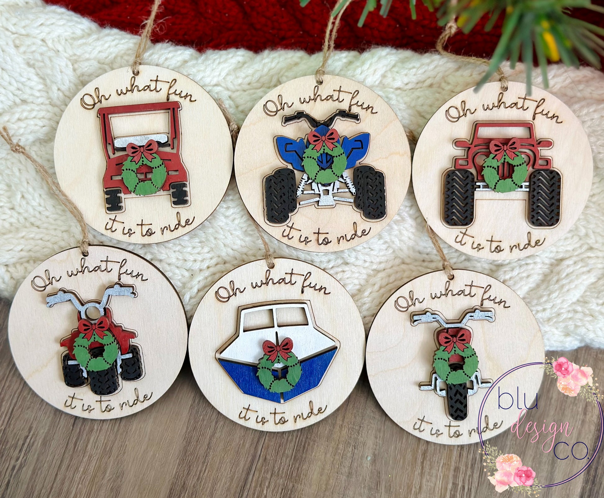 This fun ornament is made from painted layered wood on an engraved layer. Measures approx 3.25” in diameter. Available in multiple vehicle choices.