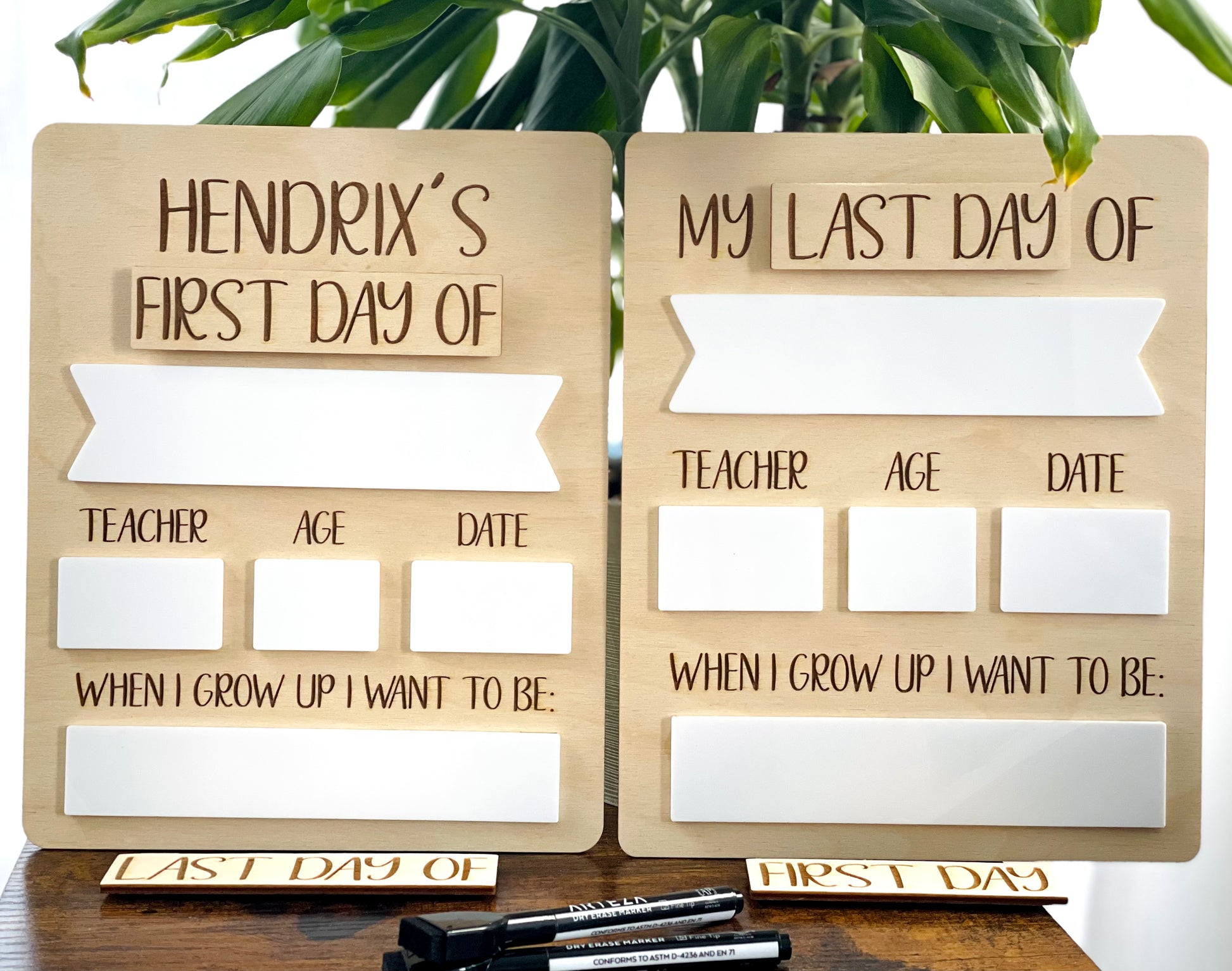 This back to school/ end of school sign measures 8” x 10” and is made of birch wood and white acrylic. Choose the velcro first day or last day piece for the top of the board and fill in the information on the white acrylic with a dry erase marker. Then your child will be all set for pictures! Choose from personalized or non-personalized board. Both shown in picture.